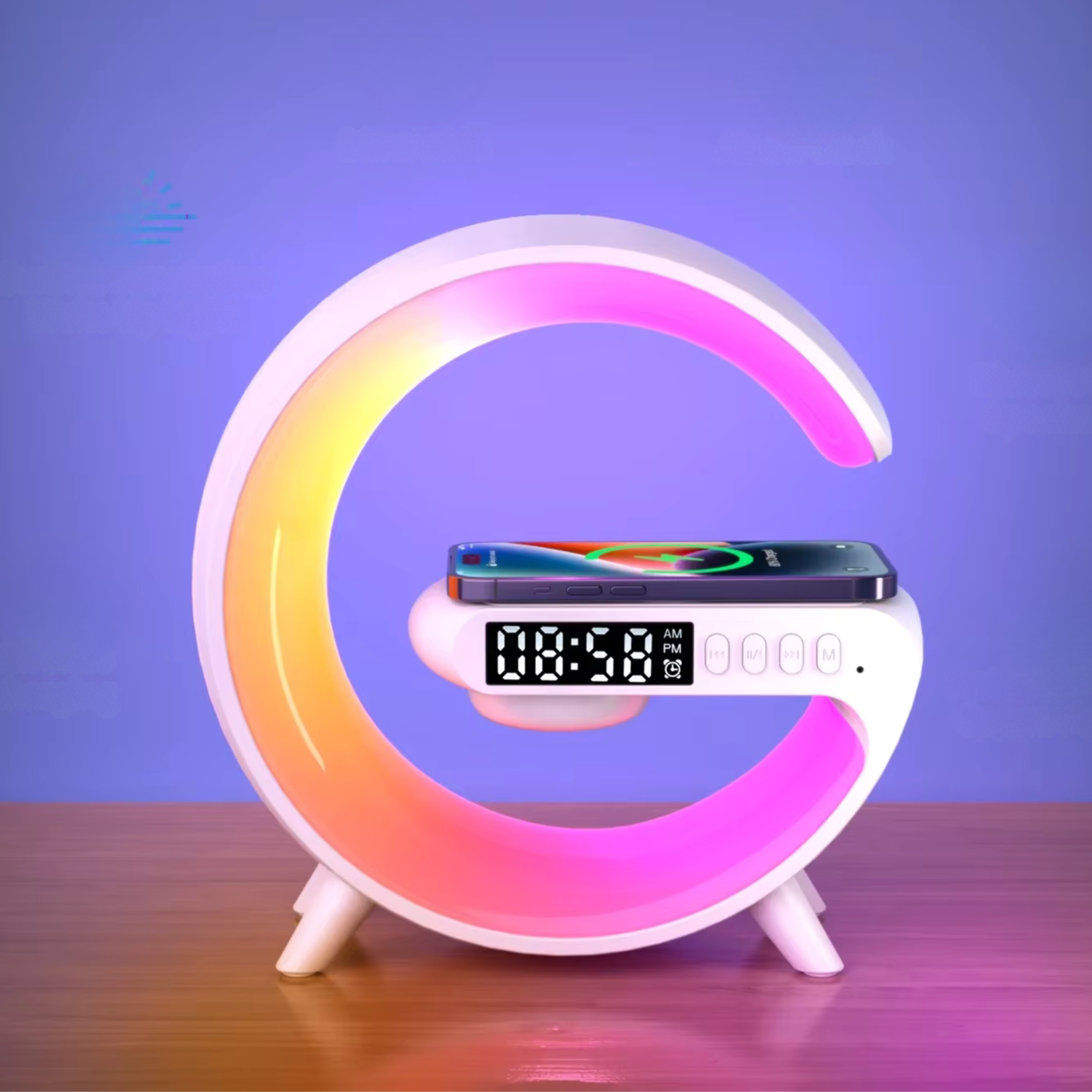 A sleek all-in-one station that charges your devices, plays your music, and lights your room.